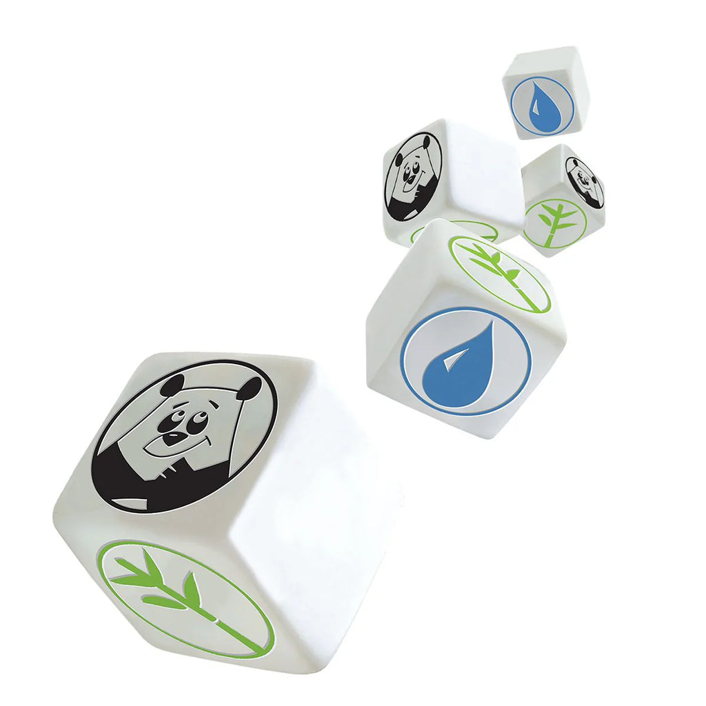 Be the first to get rid of all of your dice in Pass the Pandas by rolling pandas, bamboo, or water drops. A player who rolls pandas on her turn is able to pass those dice to other players. A roll of bamboo must be matched (or exceeded!) by the next player. A roll of water allows her to discard those dice. A blank roll does nothing to help her, and she must keep blank dice to roll again on her next turn. Pandas!